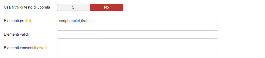 Mantenendo invece disabilitata l’opzione Usa filtro di testo di Joomla si potranno applicare dei filtri personalizzati per l’editor TinyMCE, distinti da quelli indicati a livello predefinito nella Configurazione globale del sito.