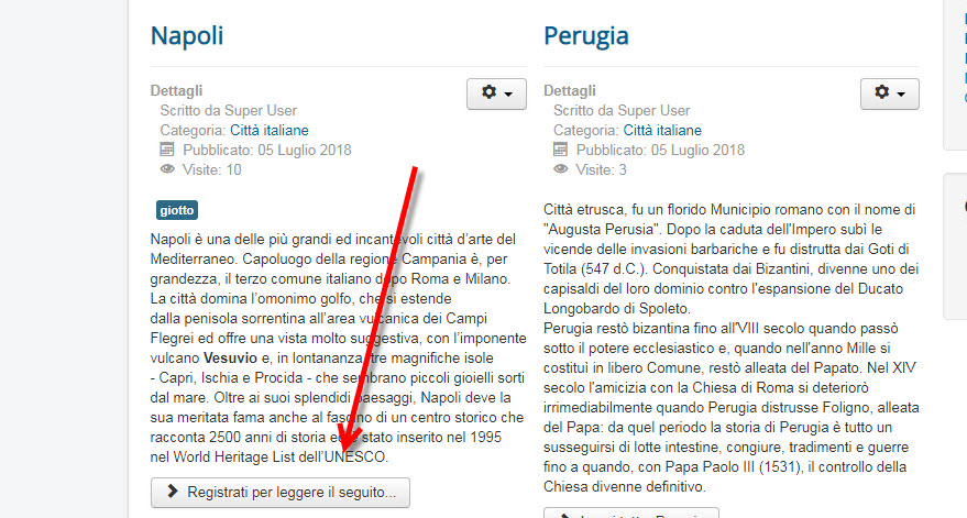 Sul frontend, nella visualizzazione blog è presente il testo introduttivo dell’articolo con accesso ristretto. Il testo del pulsante Leggi tutto indica che per leggere di più occorre registrarsi al sito (o effettuare il login se si è già registrati).