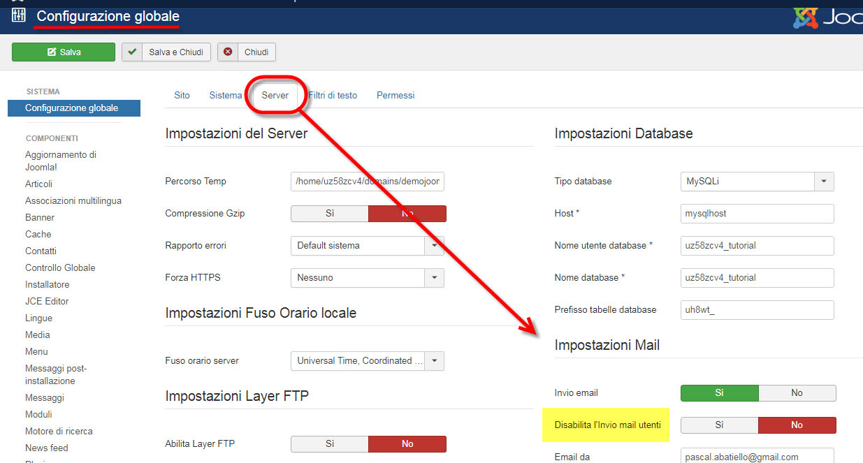 Innanzitutto per usufruire di questa funzionalità devi verificare che sia abilitata nella Configurazione globale del sito, tab Server, sezione Impostazioni Mail. L’opzione Disabilita l'invio mail utenti deve essere mantenuta sul valore NO.