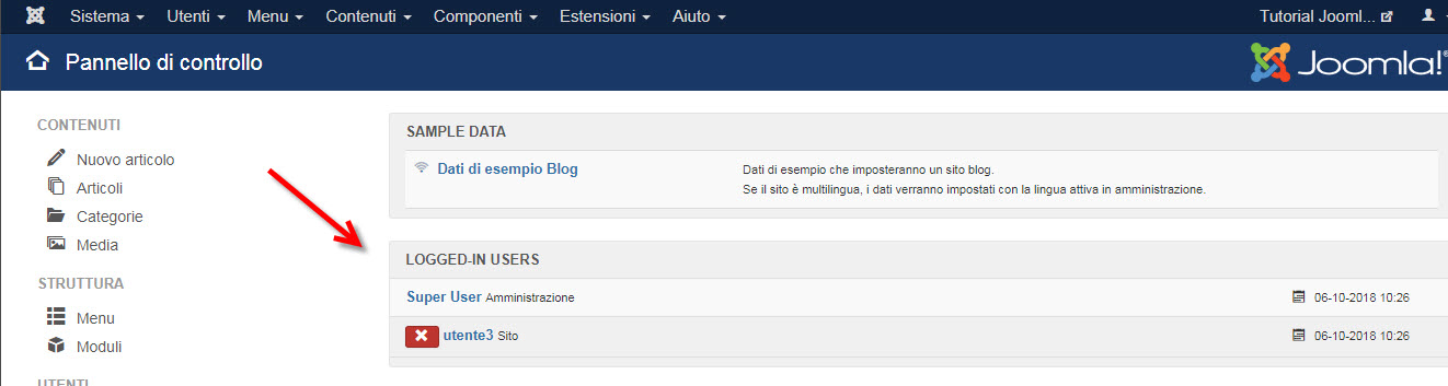 Devi mantenere attivo il modulo amministrativo Utenti Connessi. Qui si visualizzano gli ultimi utenti connessi, lato amministrativo e lato pubblico.
