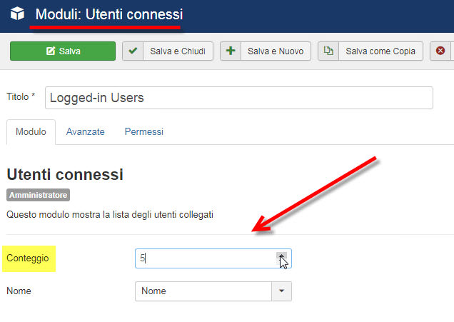 Per alzare il numero di utenti loggati che possono essere visualizzati nel modulo vai nella schermata di gestione dei moduli amministrativi, seleziona il modulo Utenti connessi e nel campo Conteggio inserisci un numero più alto rispetto a quello predefinito (che è 5).