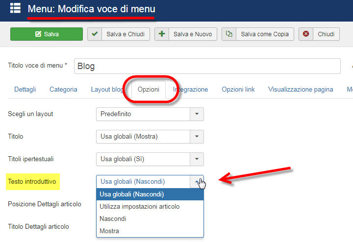 Se invece vuoi nascondere il testo introduttivo di tutti gli articoli collegati ad una voce di menu specifica, accedi nella schermata di modifica della voce di menu, nel tab Opzioni. In questo caso è possibile impostare anche il valore Utilizza impostazioni Articolo: la visualizzazione o meno del testo introduttivo è legata in questo caso al valore dell'opzione Testo introduttivo dei singoli articoli.