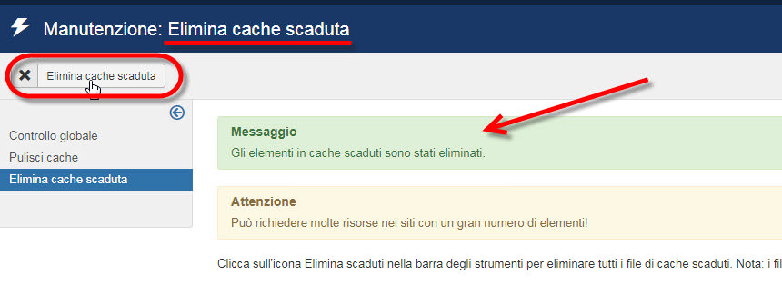Per eliminare le cache scadute devi cliccare sul pulsante Elimina cache scaduta. Al termine del processo compare il messaggio di conferma di eliminazione.